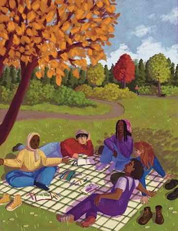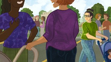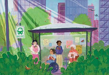 A mock illustration for an online article named “How a humble bus stop can anchor a whole neighborhood” by Nidhi Gulati